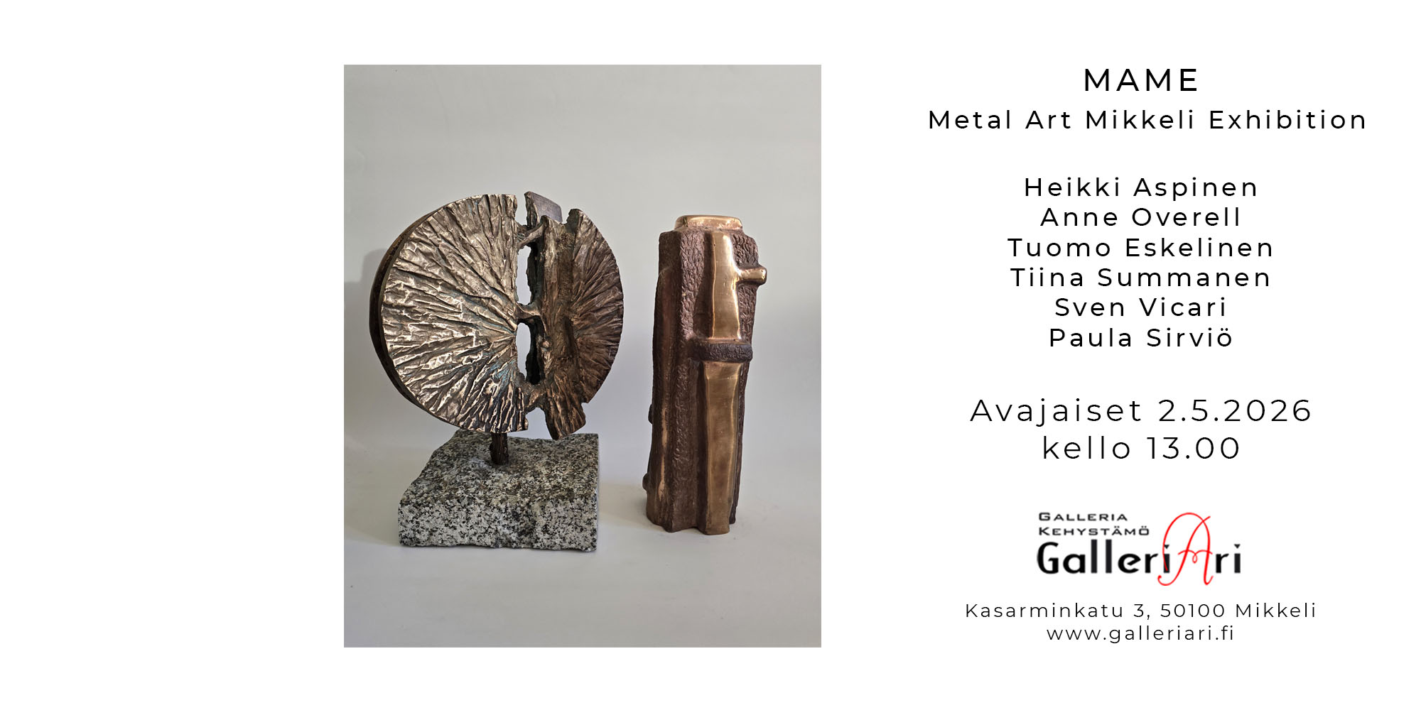 Tervetuloa MAME, Metal Art Mikkeli Exhibition taidenäyttelyn avajaisiin 2.5.2026 kello 13.00. Taiteilijat: Heikki Aspinen Anne Overell Tuomo Eskelinen Tiina Summanen…