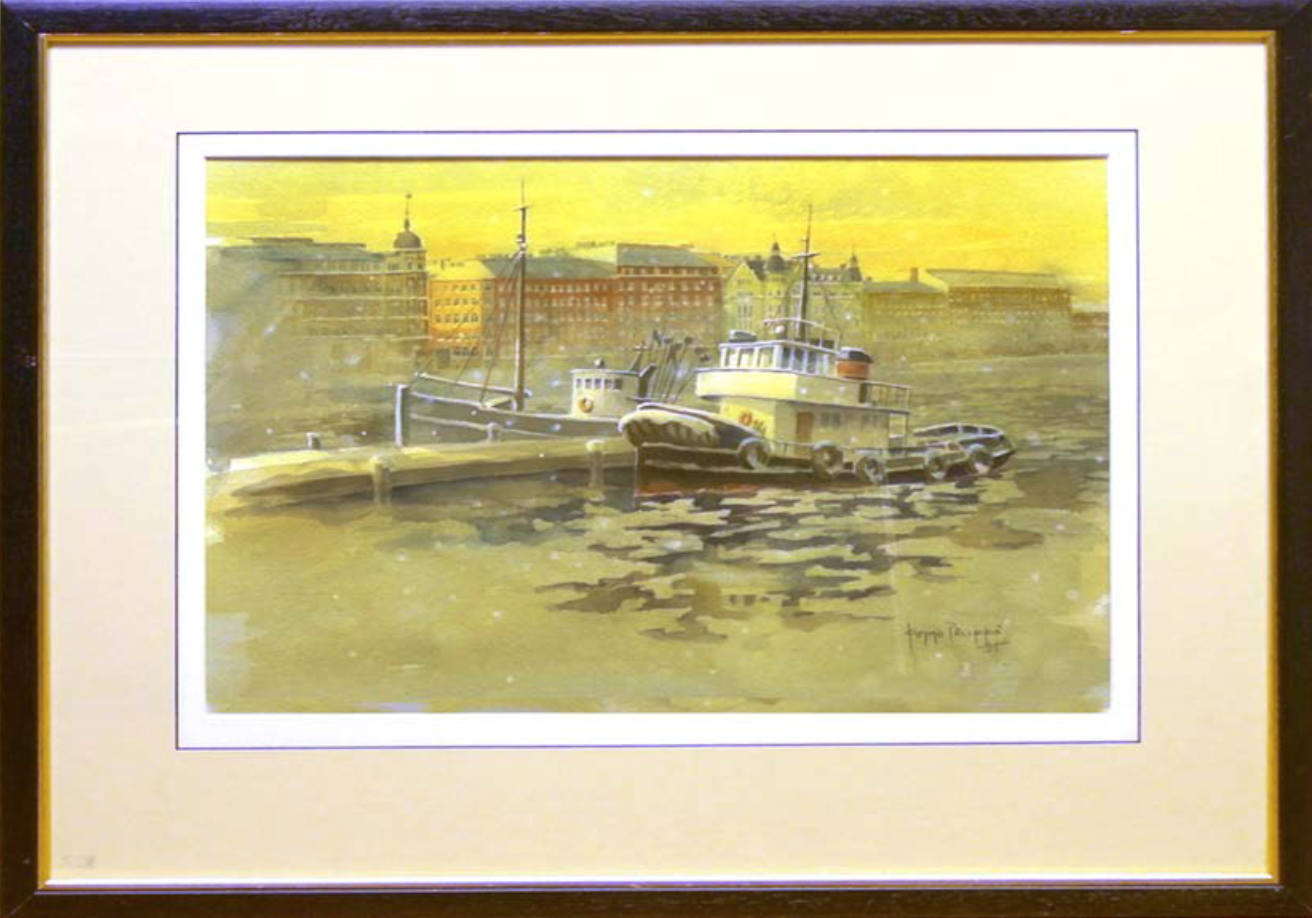 Satamahinaajat Katajanokalla, tekovuosi v. 2002, taulun ulkomitat 60 x 73 cm